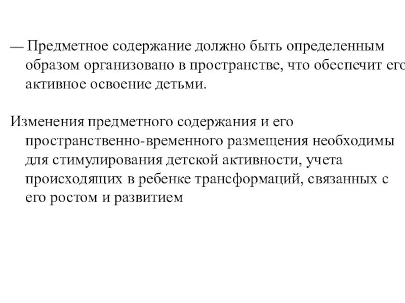 Изменения предметного содержания и его пространственно-временного размещения необходимы для стимулирования детской активности, учета происходящих в ребенке трансформаций, связанных с его ростом и развитием