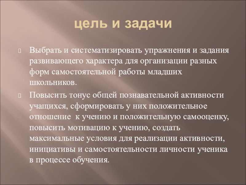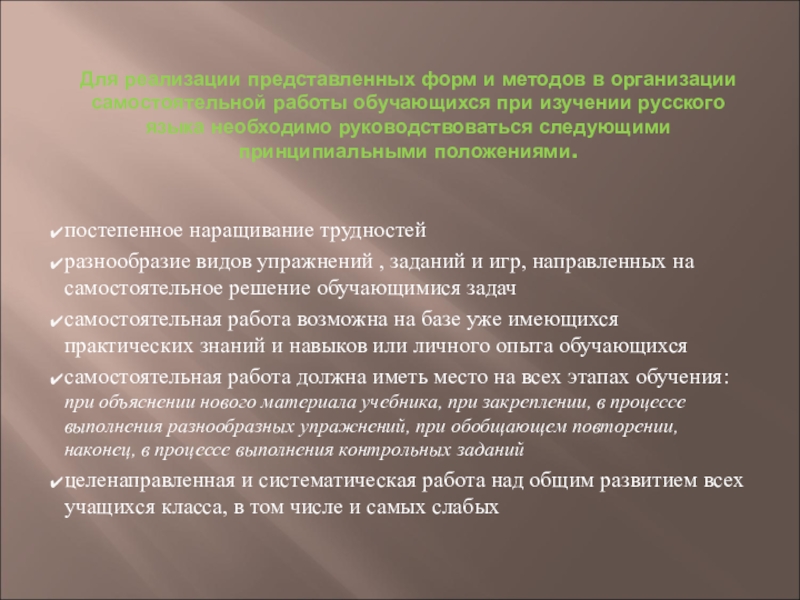 самостоятельная работа должна иметь место на всех этапах обучения: при объяснении нового материала учебника, при закреплении, в процессе выполнения разнообразных упражнений, при обобщающем повторении, наконец, в процессе выполнения контрольных заданий