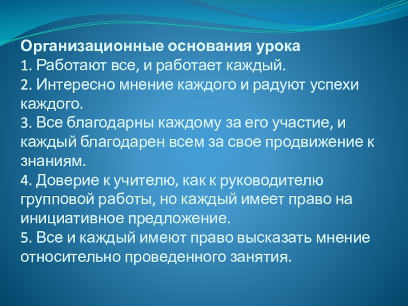 4. Доверие к учителю, как к руководителю групповой работы, но каждый имеет право на инициативное предложение.