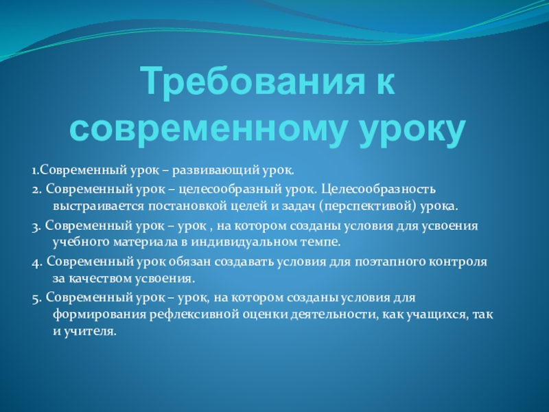 5. Современный урок – урок, на котором созданы условия для формирования рефлексивной оценки деятельности, как учащихся, так и учителя.