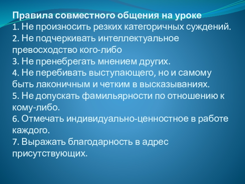 5. Все и каждый имеют право высказать мнение относительно проведенного занятия.