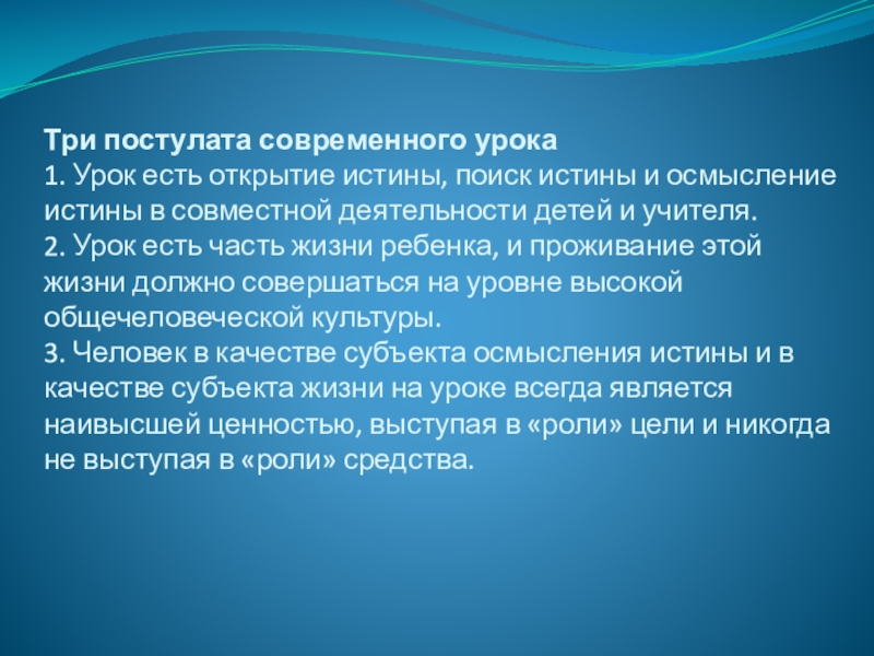 3. Человек в качестве субъекта осмысления истины и в качестве субъекта жизни на уроке всегда является наивысшей ценностью, выступая в «роли» цели и никогда не выступая в «роли» средства.