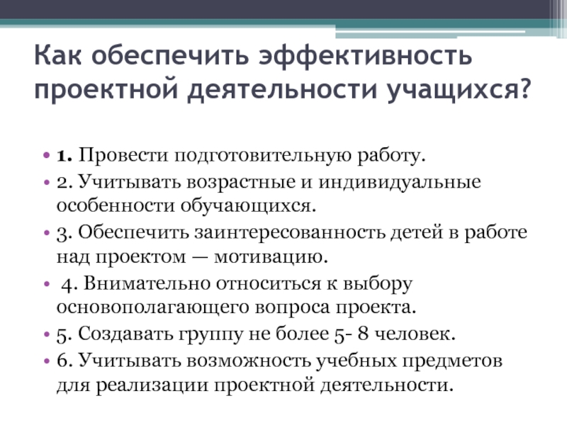 Слайд 13Как обеспечить эффективность проектной деятельности учащихся?