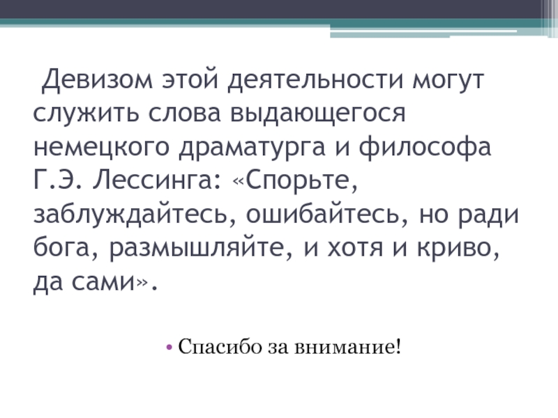 философа Г.Э. Лессинга: «Спорьте, заблуждайтесь, ошибайтесь, но ради бога, размышляйте, и хотя и криво, да сами».