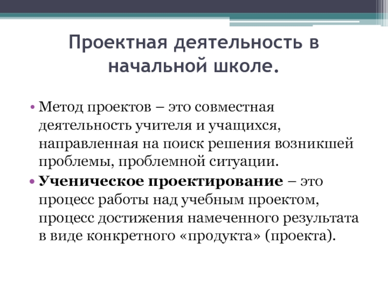 Ученическое проектирование – это процесс работы над учебным проектом, процесс достижения намеченного результата в виде конкретного «продукта» (проекта).