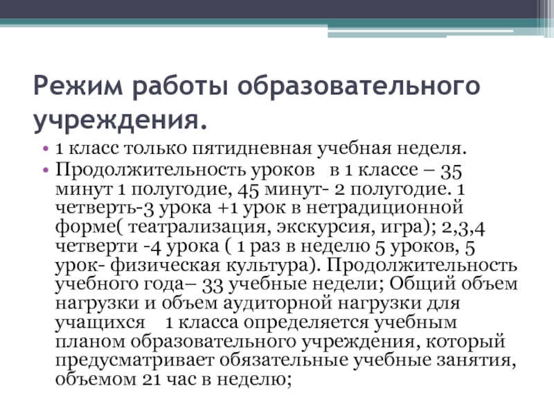 в 1 классе – 35 минут 1 полугодие, 45 минут- 2 полугодие. 1 четверть-3 урока +1 урок в нетрадиционной форме( театрализация, экскурсия, игра); 2,3,4 четверти -4 урока ( 1 раз в неделю 5 уроков, 5 урок- физическая культура). Продолжительность учебного года– 33 учебные недели; Общий объем нагрузки и объем аудиторной нагрузки для учащихся 1 класса определяется учебным планом образовательного учреждения, который предусматривает обязательные учебные занятия, объемом 21 час в неделю;