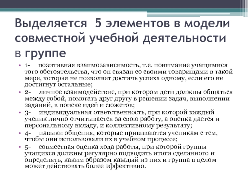 Слайд 6Выделяется 5 элементов в модели совместной учебной деятельности в группе