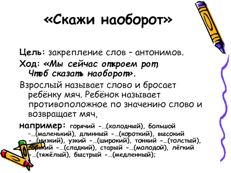 называет слово и бросает ребёнку мяч. Ребёнок называет противоположное по значению слово и возвращает мяч,