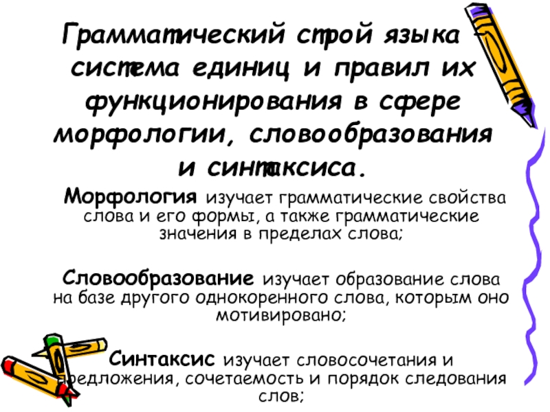 Морфология изучает грамматические свойства слова и его формы, а также грамматические значения в пределах слова;