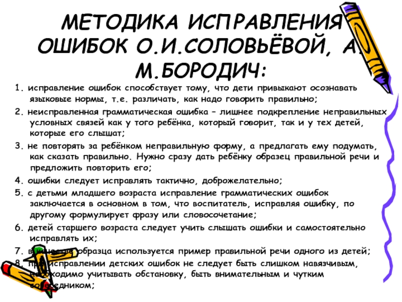 Слайд 16МЕТОДИКА ИСПРАВЛЕНИЯ ОШИБОК О.И.СОЛОВЬЁВОЙ, А.М.БОРОДИЧ: