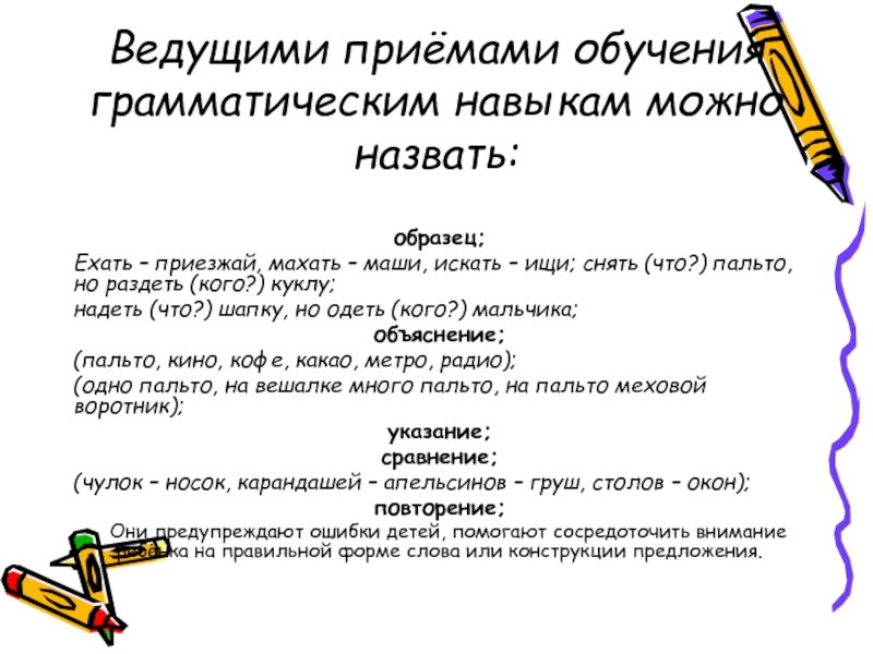 Слайд 13Ведущими приёмами обучения грамматическим навыкам можно назвать: