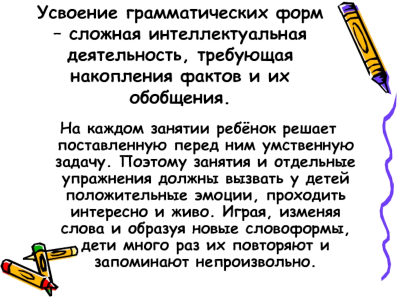 Слайд 14Усвоение грамматических форм – сложная интеллектуальная деятельность, требующая накопления фактов и