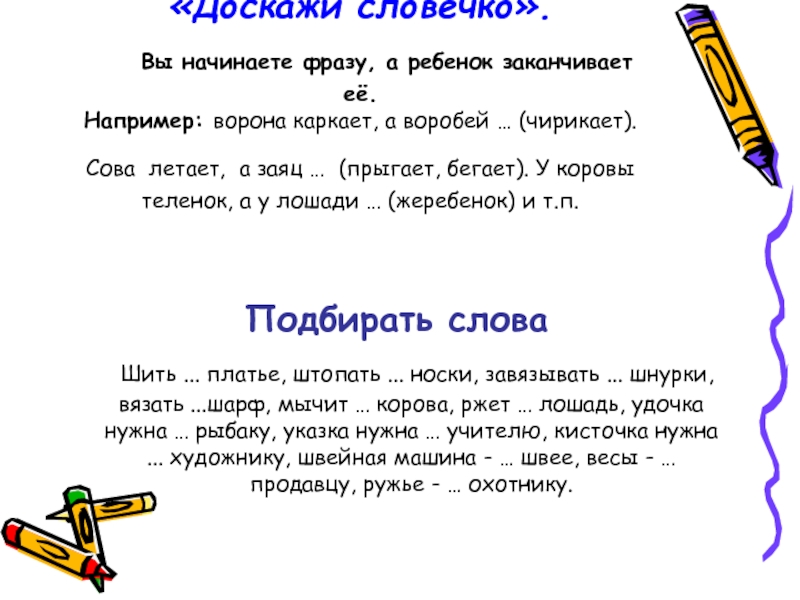 ворона каркает, а воробей … (чирикает). Сова летает, а заяц … (прыгает, бегает). У коровы теленок, а у лошади … (жеребенок) и т.п.