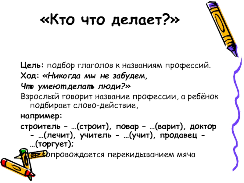 Взрослый говорит название профессии, а ребёнок подбирает слово-действие,