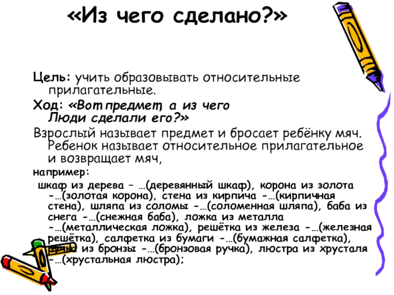 Взрослый называет предмет и бросает ребёнку мяч. Ребенок называет относительное прилагательное и возвращает мяч,