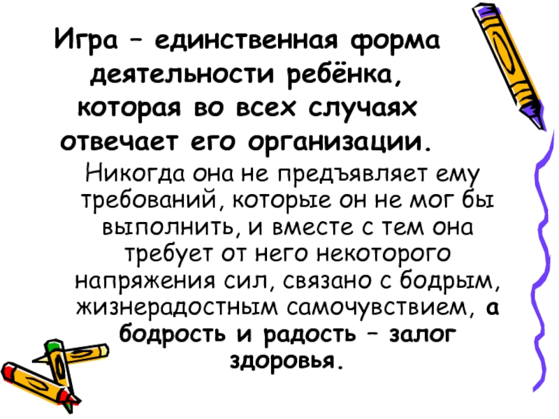 Слайд 9Игра – единственная форма деятельности ребёнка, которая во всех случаях отвечает