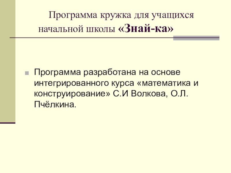 Программа разработана на основе интегрированного курса «математика и конструирование» С.И Волкова, О.Л. Пчёлкина.