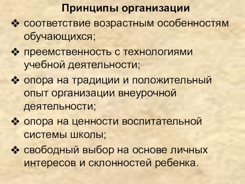 Принципы организациисоответствие возрастным особенностям обучающихся;преемственность с технологиями учебной деятельности;опора на традиции и положительный опыт организации внеурочной деятельности;опора