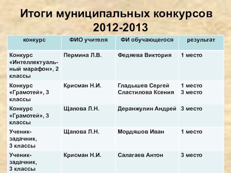 Слайд 10Итоги муниципальных конкурсов 2012-2013