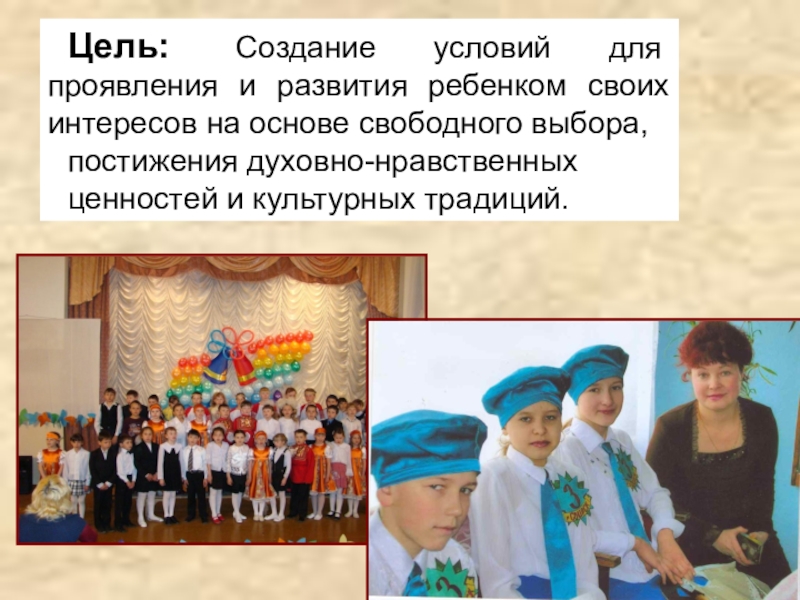 Цель: Создание условий для проявления и развития ребенком своих интересов на основе свободного выбора, постижения духовно-нравственных ценностей
