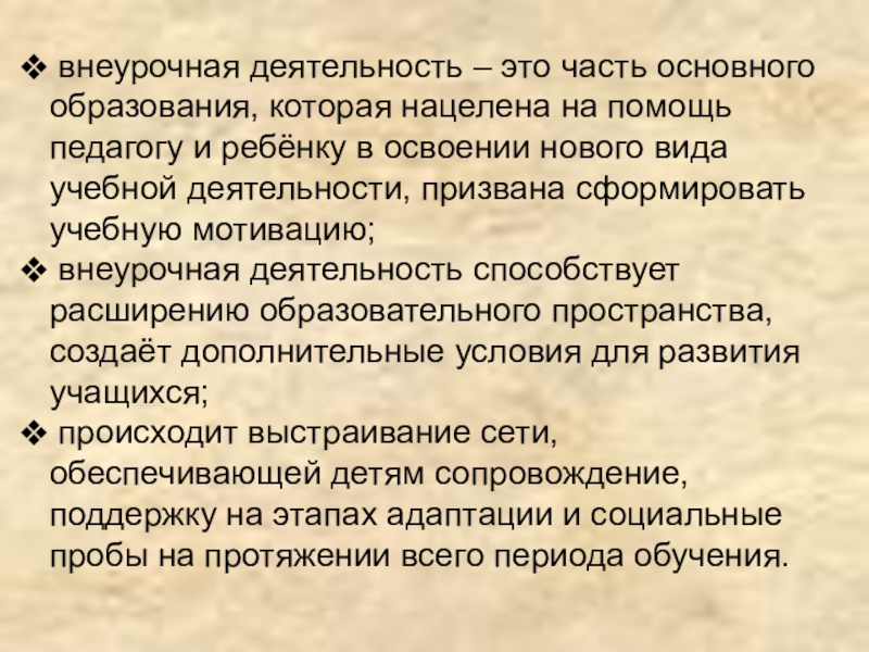 внеурочная деятельность – это часть основного образования, которая нацелена на помощь педагогу и ребёнку в освоении нового вида учебной деятельности, призвана сформировать учебную мотивацию; внеурочная деятельность способствует расширению образовательного пространства, создаёт дополнительные условия для развития