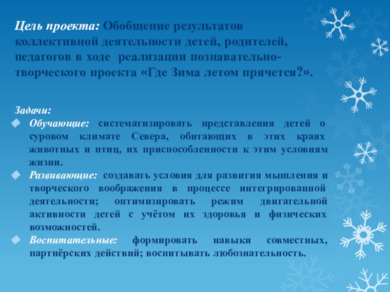 Обучающие: систематизировать представления детей о суровом климате Севера, обитающих в этих краях животных и птиц, их приспособленности к этим условиям жизни.