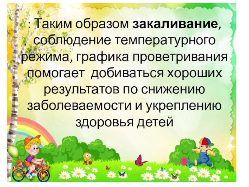 Слайд 19 : Таким образом закаливание, соблюдение температурного режима, графика проветривания помогает добиваться хороших