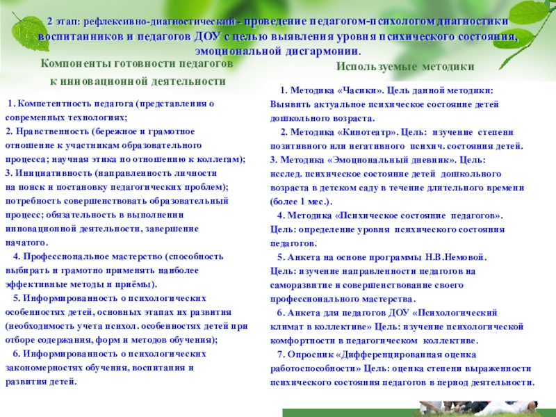 2 этап: рефлексивно-диагностический - проведение педагогом-психологом диагностики воспитанников и педагогов ДОУ с целью выявления уровня психического состояния, эмоциональной дисгармонии.