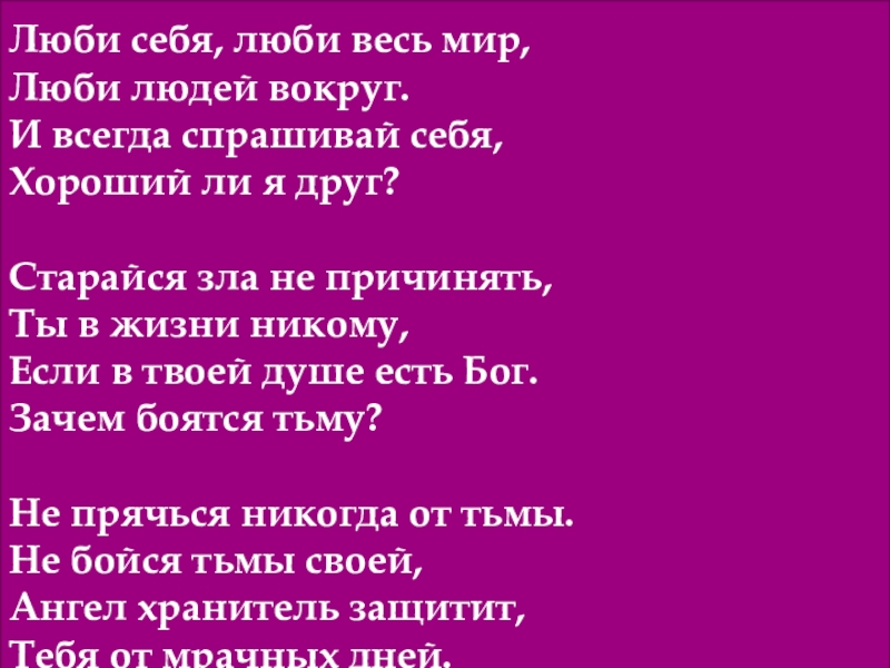 Люби себя, люби весь мир, Люби людей вокруг. И всегда спрашивай себя, Хороший ли я друг?Старайся зла