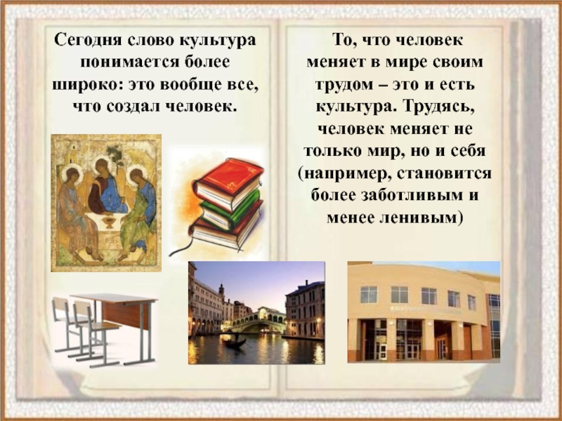 То, что человек меняет в мире своим трудом – это и есть культура. Трудясь, человек меняет не только мир, но и себя (например, становится более заботливым и менее ленивым)