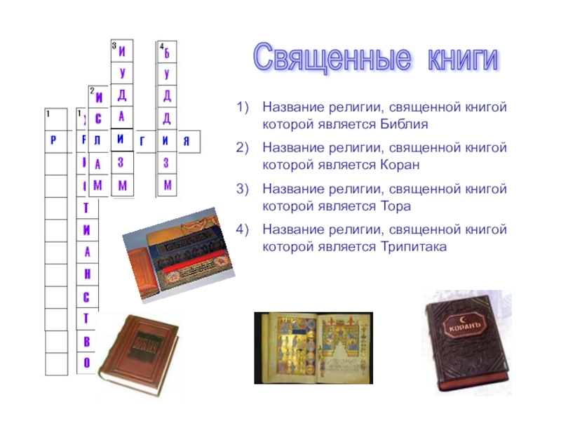 Священные книгиНазвание религии, священной книгой которой является БиблияНазвание религии, священной книгой которой является КоранНазвание религии, священной книгой