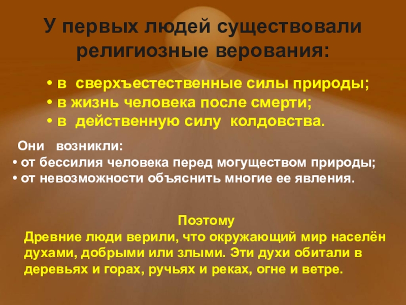 Древние люди верили, что окружающий мир населён духами, добрыми или злыми. Эти духи обитали в деревьях и горах, ручьях и реках, огне и ветре.
