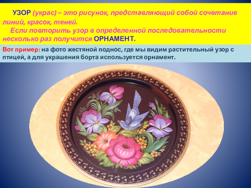 Вот пример: на фото жестяной поднос, где мы видим растительный узор с птицей, а для украшения борта используется орнамент.