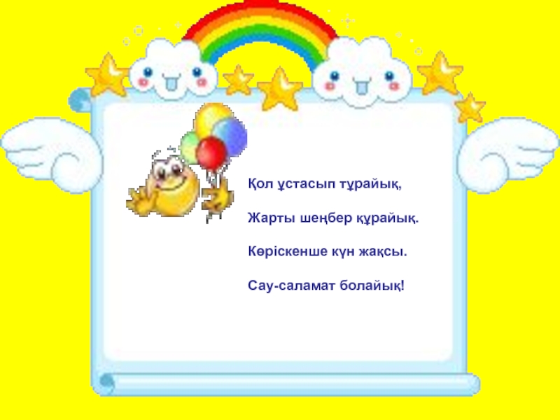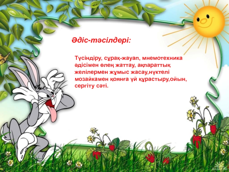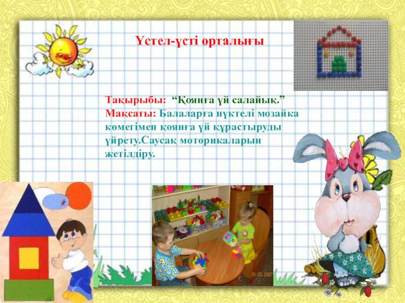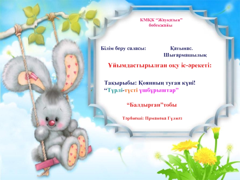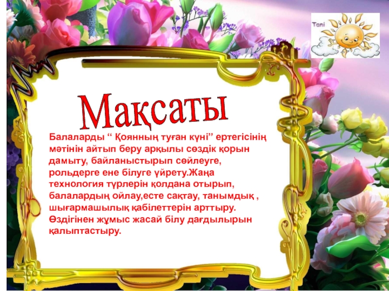 Мақсаты:Балаларға “ Қоянның туған күні”ертегісінің мазмұнын түсініп айта білуге үйрету.Байланыстырып сөйлеу арқылы тілдерін дамыту. Ойлау,есте сақтау қабілеттерін арттыру,рольдерге ену арқылы,сахналау шеберліктерін арттыру.