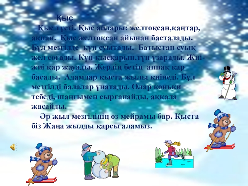 Бұл мезгілде күн суытады. Батыстан суық жел соғады. Күн қысқарып,түн ұзарады. Жиі-жиі қар жауады. Жердің бетін аппақ қар басады. Адамдар қыста жылы киінеді. Бұл мезгілді балалар ұнатады. Олар коньки тебеді, шаңғымен сырғанайды, аққала жасайды.