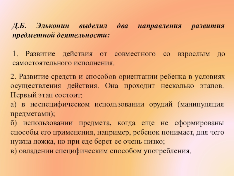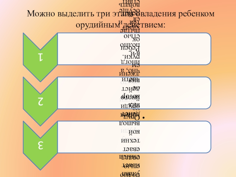 2. Развитие средств и способов ориентации ребенка в условиях осуществления действия. Она проходит несколько этапов. Первый этап состоит:
