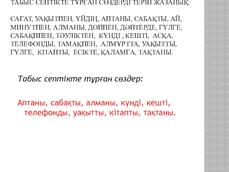 Аптаны, сабақты, алманы, күнді, кешті, телефонды, уақытты, кітапты, тақтаны.