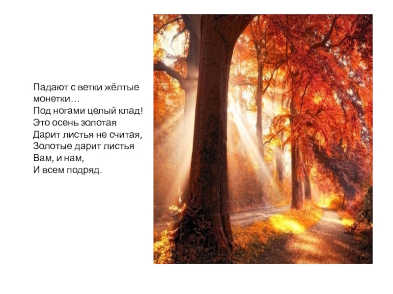 Слайд 18Падают с ветки жёлтые монетки… Под ногами целый клад! Это осень золотая Дарит листья