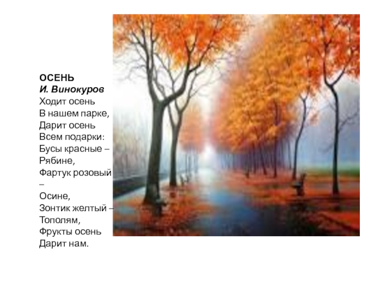 ОСЕНЬ И. ВинокуровХодит осень В нашем парке, Дарит осень Всем подарки: Бусы красные – Рябине, Фартук розовый – Осине, Зонтик желтый – Тополям, Фрукты осень Дарит нам.