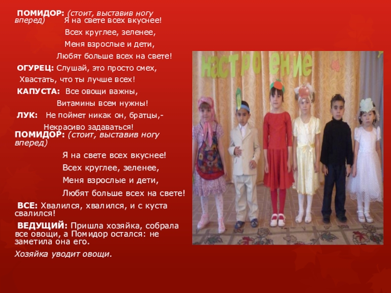 Слайд 26 ПОМИДОР: (стоит, выставив ногу вперед) Я на свете всех вкуснее!