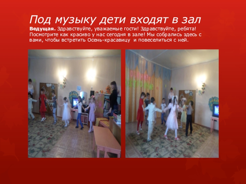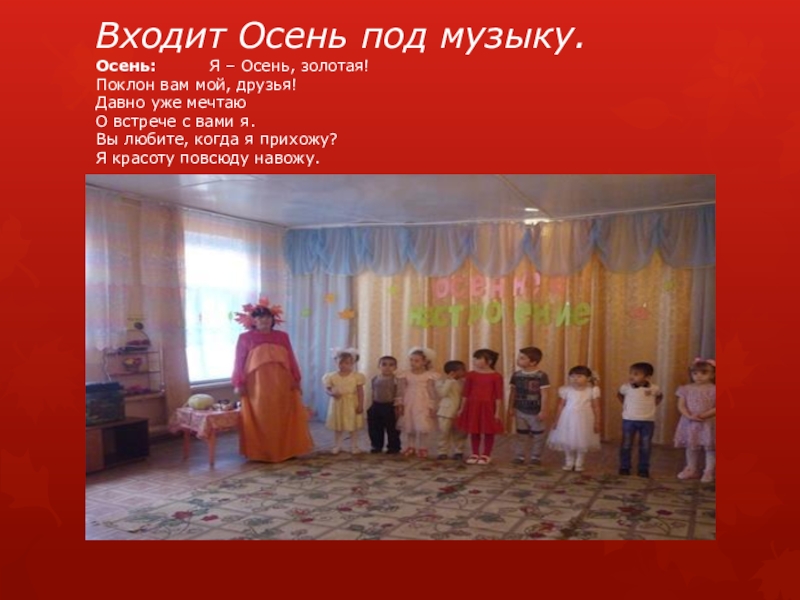 как красиво у нас сегодня в зале! Мы собрались здесь с вами, чтобы встретить Осень-красавицу и повеселиться с ней.