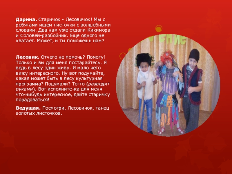 Слайд 20Дарина. Старичок - Лесовичок! Мы с ребятами ищем листочки с волшебными