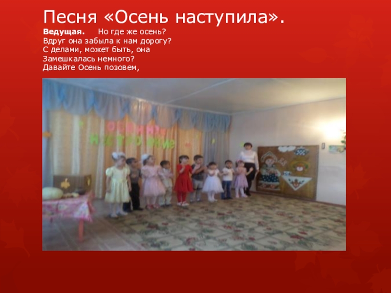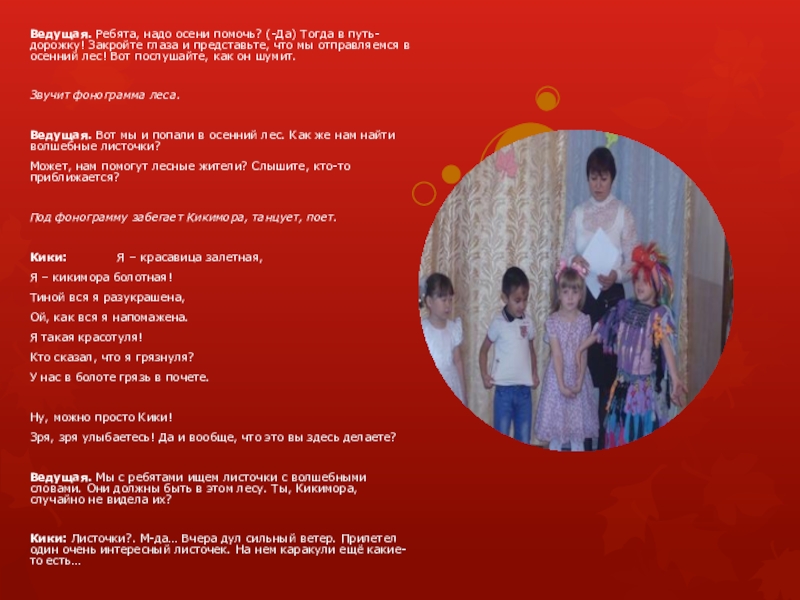 Слайд 11Ведущая. Ребята, надо осени помочь? (-Да) Тогда в путь-дорожку! Закройте глаза и