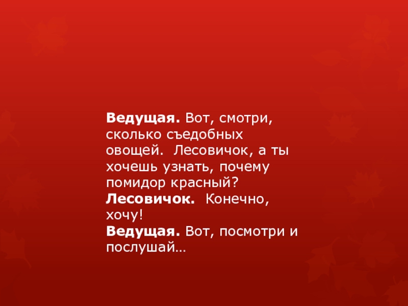 Слайд 25Ведущая. Вот, смотри, сколько съедобных овощей. Лесовичок, а ты хочешь узнать, почему