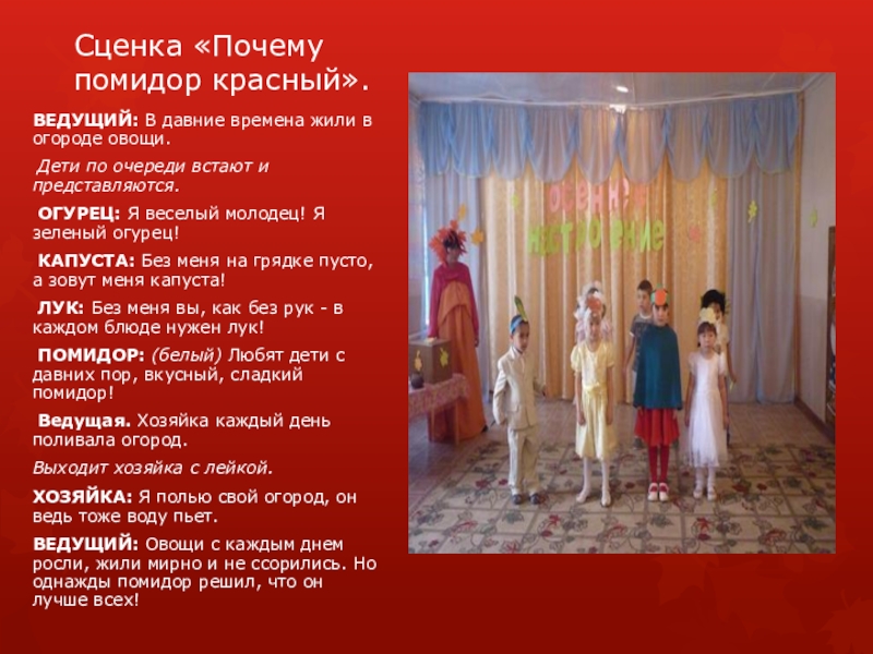 ВЕДУЩИЙ: Овощи с каждым днем росли, жили мирно и не ссорились. Но однажды помидор решил, что он лучше всех!