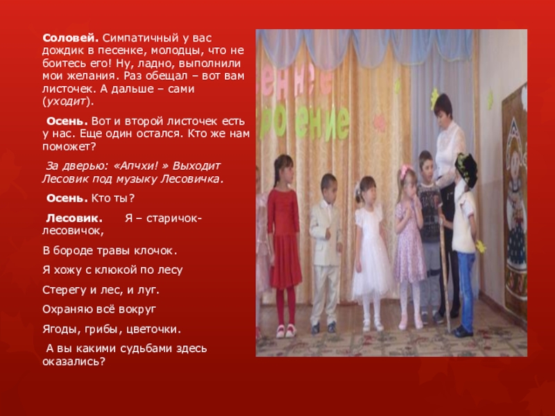 Слайд 19Соловей. Симпатичный у вас дождик в песенке, молодцы, что не боитесь его!