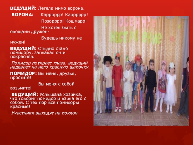 ВЕДУЩИЙ: Пришла хозяйка, собрала все овощи, а Помидор остался: не заметила она его.
