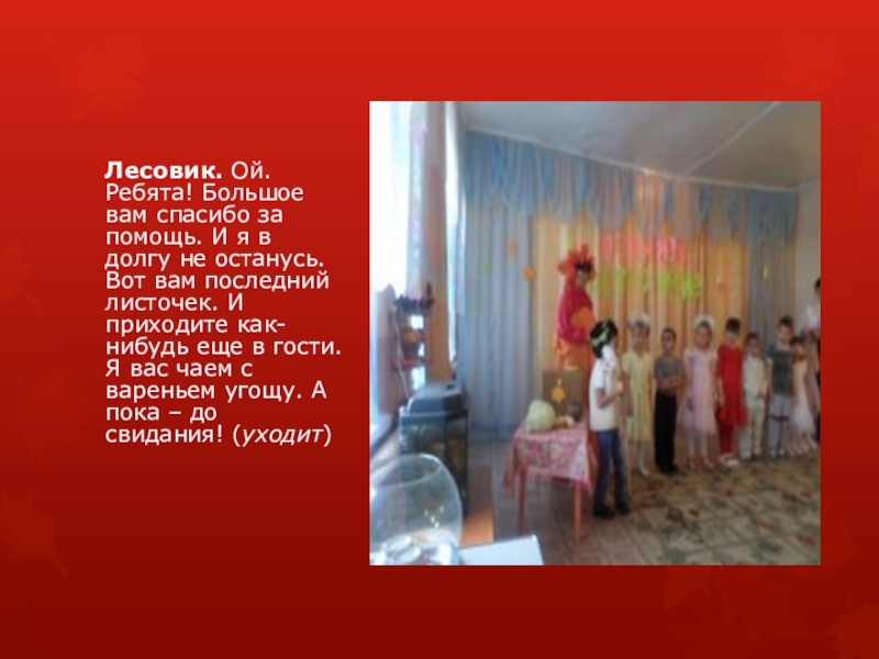 Слайд 28Лесовик. Ой. Ребята! Большое вам спасибо за помощь. И я в долгу