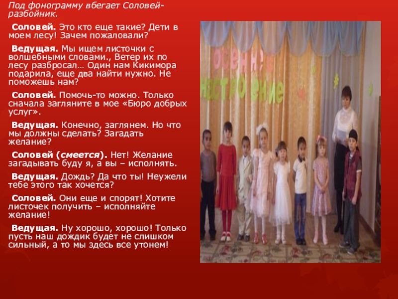 Ведущая. Мы ищем листочки с волшебными словами., Ветер их по лесу разбросал… Один нам Кикимора подарила, еще два найти нужно. Не поможешь нам?