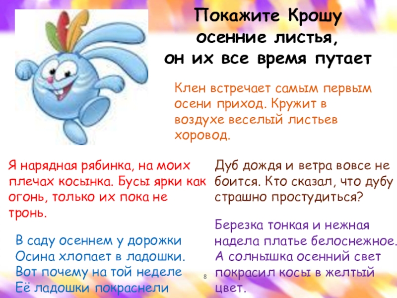 Я нарядная рябинка, на моих плечах косынка. Бусы ярки как огонь, только их пока не тронь.